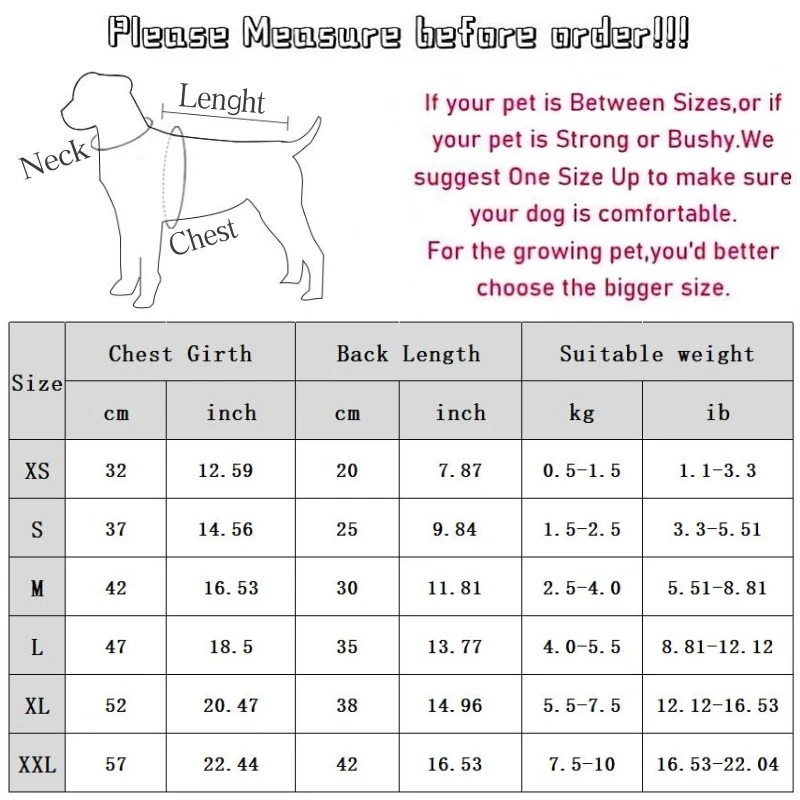 S: Chest 37cm/14.56'' ; Length 25cm/9.84'' ; Suitable weight 1.5-2.5kg/3.3-5.51ib