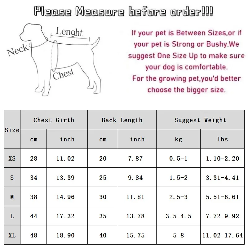 XL Chest Girth 48cm/18.90'' ;Back Length 40cm/15.75''; Suggest Weight 5-8kg/11.02-17.64 lbs
