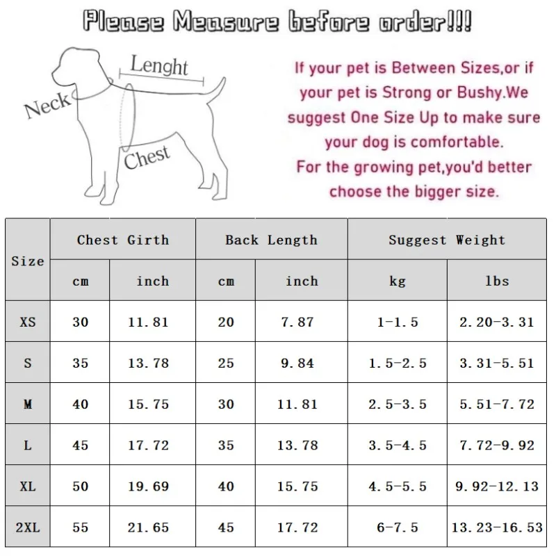 XXL Chest 55cm/18.90'' Length 45cm/17.72'' Suggest Weight 6.0-7.5kg/13.23-16.53 lbs